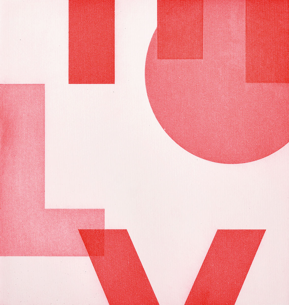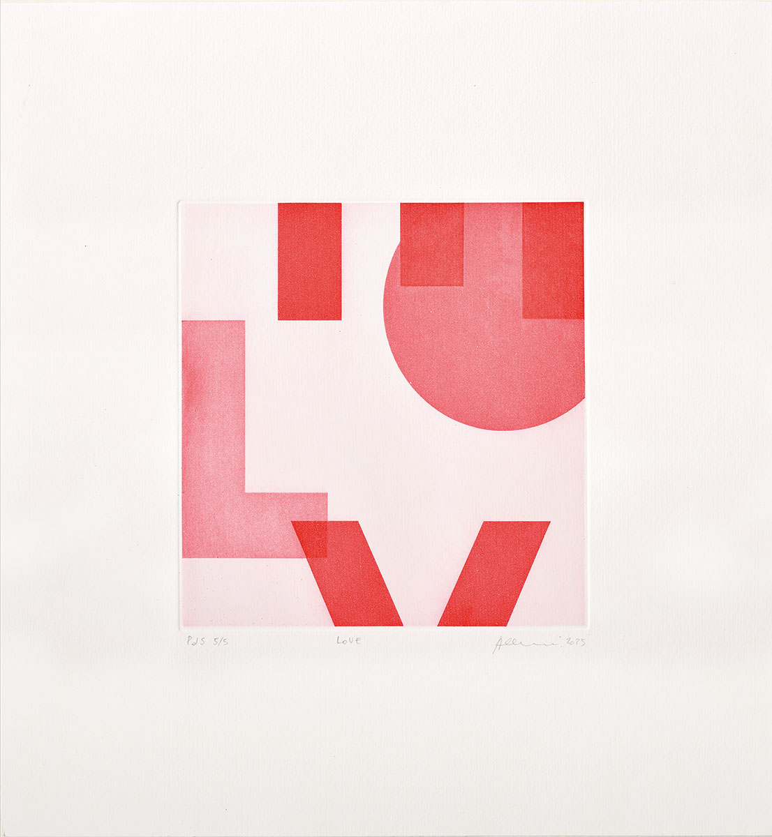 LOVE è una grafica artistica, che unisce la tecnica artigianale dell’acquatinta a un processo digitale di predisposizione della lastra. LOVE è una delle dieci parole che, nel 2008, avevo scelto e dedicato alla mia prima figlia: termini-chiave pensati per condensare concetti fondamentali che potessero accompagnarla nel tempo della crescita. Quel lavoro, intitolato Words x V, presentava le parole, ricamate con filo colorato e perline in tinta, ancora pienamente leggibili, affinché evocassero suggestioni positive (o, talvolta, volutamente negative). Nel 2024 ho ripreso quelle stesse parole, riscrivendole e rielaborandole graficamente fino a far perdere la loro leggibilità immediata e invitando lo spettatore a un gioco di decifrazione e di immedesimazione personale per il significato che la parola evoca. L’opera, dedicata questa volta anche alla mia seconda figlia, porta il titolo WxV&M, II.
